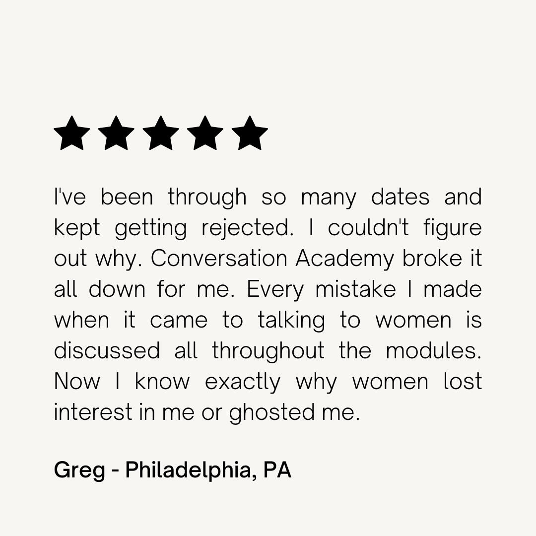 I recently purchased Conversation Academy Course and let me share with you, in my personal experience it was a really great investment. This is an eye-opening course. It comes with incredible resources and knowledgeable guides on what to look for and expect and how to react and respond in various situations when engaging with beautiful, intelligent women. You’ll learn about how women really perceive you in various situations and how you’re most basic actions - which you thought weren’t a big deal - are truly being critiqued.The bonus access to Dominate Dating is a huge perk when getting Conversation Academy. Being able to DM Kamilla directly, read more of her unfiltered advice, and run as many questions as I want by her is a tremendous resource.This course is truly a dynamic analysis of how to up your conversation game and experience with women to a higher level. Some of the lessons there have shaped me for life. I will never think the same again.
